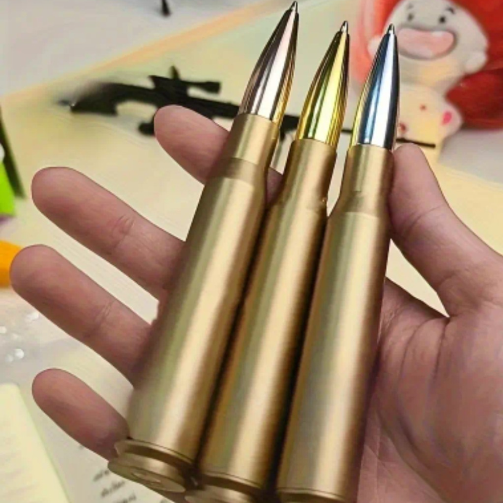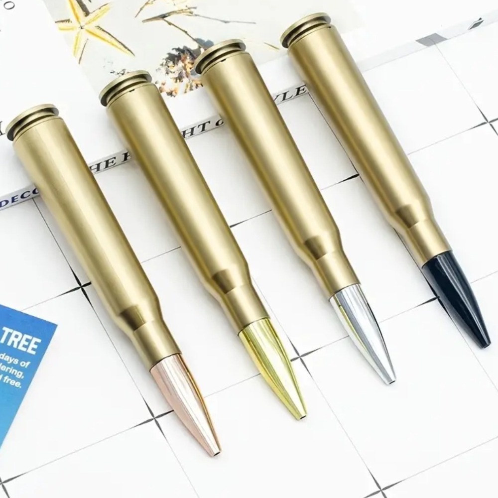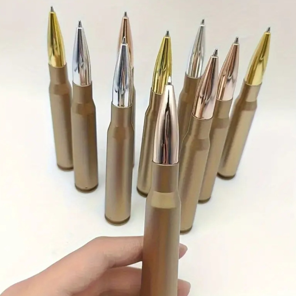 Med denne fede kuglepen skiller du dig i sandhed ud når du står og noterer. Kuglepennen ligner et 12,7 patron, men lad ikke op med den! Denne super fede militærstil med gyldent komfortgreb, skruehætte, brun plastikskrog er perfekt til studerende og kontor uagtet om kontoret er indendørs eller ude i skoven.